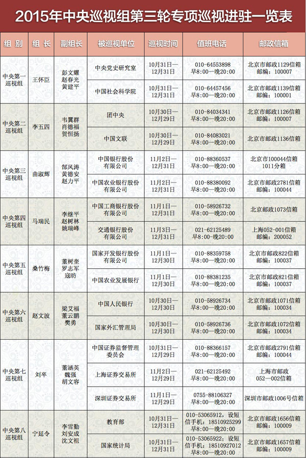 2015年中央巡視組第三輪專項巡視進駐一覽表(一)