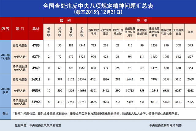 2015年12月全國查處違反中央八項規定精神問題4785起