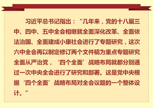 六中全會閉幕后,有外電評論:“四個全面”戰略布局將中共管黨治黨提升到了國家發展戰略的新高度;這次全會對全面從嚴治黨作出新部署,鞏固了“四個全面”戰略布局治國理政總方略的地位。 4年前,習近平總書記履新伊始,就把黨要管黨、從嚴治黨放在更加突出的位置。“打鐵還需自身硬”,他用通俗易懂的語言,向人民作出莊嚴承諾。 2年前,在江蘇考察時,習近平總書記強調,全面從嚴治黨是推進黨的建設新的偉大工程的必然要求。在“從嚴治黨”之前加上“全面”兩字,展現出黨中央的遠見卓識和使命擔當,也完整勾畫出“四個全面”戰略布局。 協調推進“四個全面”戰略布局,是黨的十八大以來黨中央從實現“兩個一百年”奮斗目標、實現中華民族偉大復興的中國夢的戰略高度,統籌國內國際兩個大局,把握我國發展新特征確定的治國理政新方略,是新的時代條件下推進改革開放和社會主義現代化建設、堅持和發展中國特色社會主義的戰略抉擇。