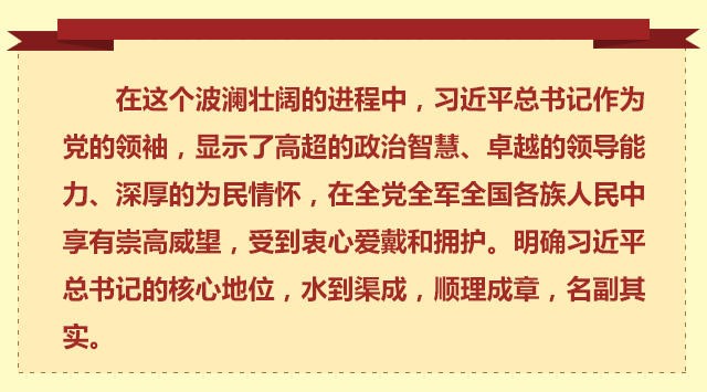 黨的十八屆六中全會公報正式提出“以習近平同志為核心的黨中央”。當全會公報獲得一致通過時,會場響起熱烈的掌聲。 這掌聲,反映了中央委員會的一致愿望; 這掌聲,表達了全黨全軍全國各族人民的共同心聲; 這掌聲,昭示出中國共產黨帶領中華民族走向偉大復興的堅定信心。 一個國家、一個政黨,領導核心至關重要。 黨的十八大以來,以習近平同志為核心的黨中央帶領全黨全軍全國各族人民,開創了中國特色社會主義偉大事業新局面,在改革發展穩定、內政外交國防、治黨治國治軍等方面取得了一系列具有重大現實意義和深遠歷史意義的成就,實現了黨和國家事業繼往開來。 黨的十八大以來,以習近平同志為核心的黨中央身體力行、率先垂范,堅定推進全面從嚴治黨,堅持思想建黨和制度治黨緊密結合,集中整飭黨風,嚴厲懲治腐敗,凈化黨內政治生態,黨內政治生活展現新氣象,贏得了黨心民心。