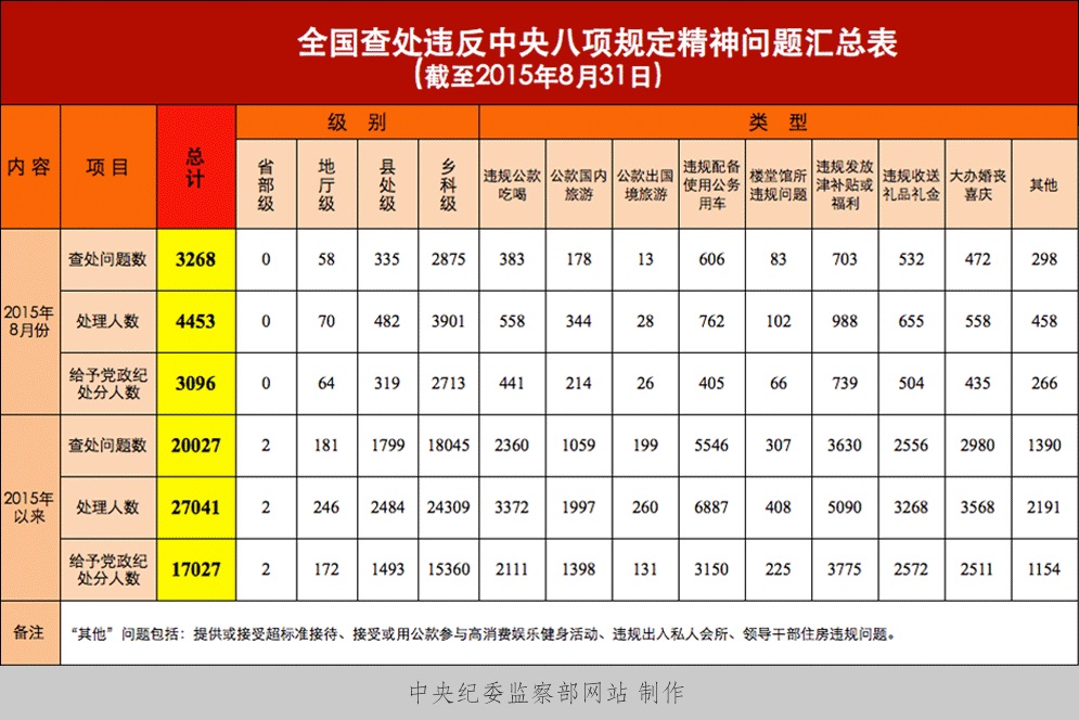 2015年8月全國查處違反中央八項規定精神問題3268起