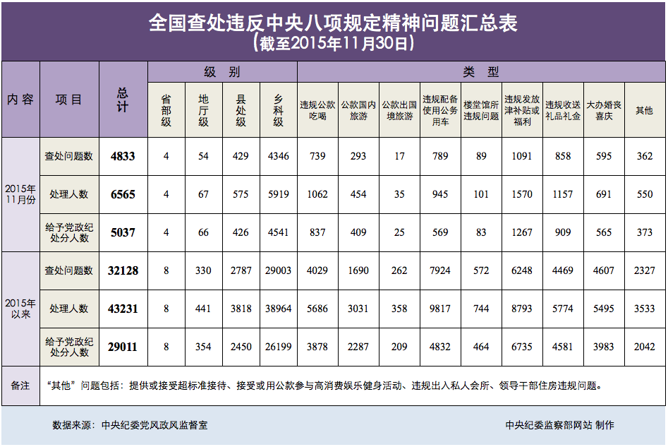 | 2015年11月全國查處違反中央八項規(guī)定精神問題4833起 | |
