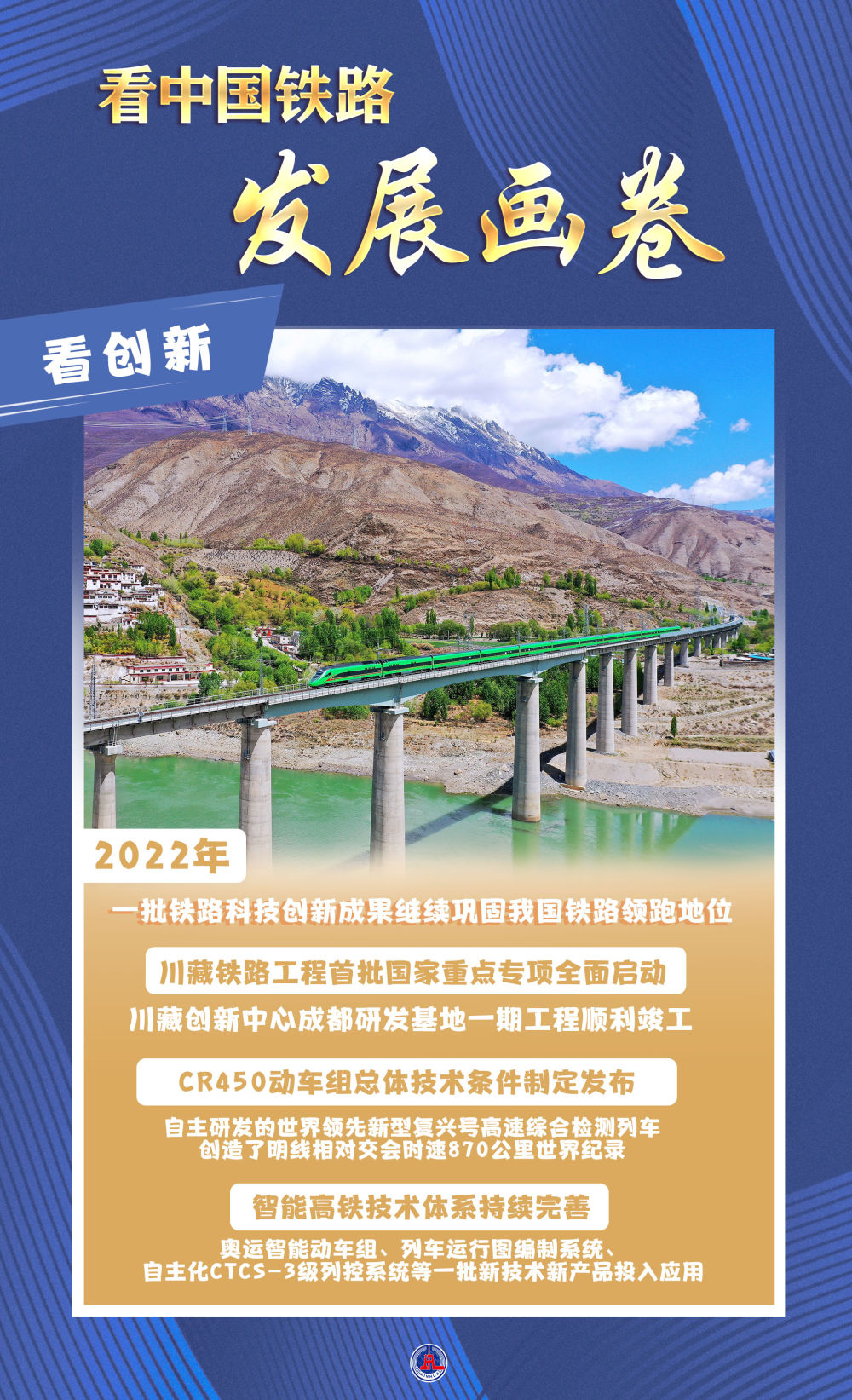 2022年,一批鐵路科技創(chuàng)新成果繼續(xù)鞏固我國鐵路領(lǐng)跑地位:川藏鐵路工程首批國家重點(diǎn)專項(xiàng)全面啟動,川藏創(chuàng)新中心成都研發(fā)基地一期工程順利竣工;CR450動車組總體技術(shù)條件制定發(fā)布,自主研發(fā)的世界領(lǐng)先新型復(fù)興號高速綜合檢測列車創(chuàng)造了明線相對交會時(shí)速870公里世界紀(jì)錄;智能高鐵技術(shù)體系持續(xù)完善,奧運(yùn)智能動車組、列車運(yùn)行圖編制系統(tǒng)、自主化CTCS-3級列控系統(tǒng)等一批新技術(shù)新產(chǎn)品投入應(yīng)用。
