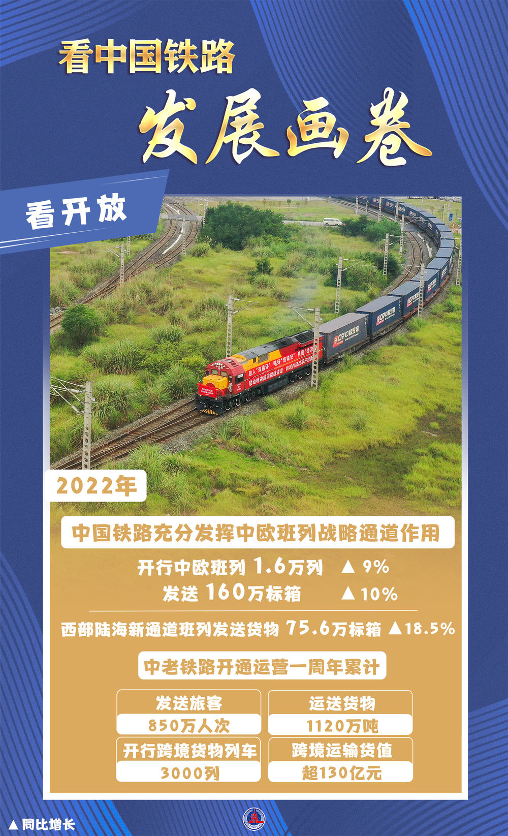 2022年,中國鐵路充分發(fā)揮中歐班列戰(zhàn)略通道作用,開行中歐班列1.6萬列、發(fā)送160萬標(biāo)箱,同比分別增長9%、10%;西部陸海新通道班列發(fā)送貨物75.6萬標(biāo)箱,同比增長18.5%。中老鐵路開通運(yùn)營一周年累計(jì)發(fā)送旅客850萬人次,運(yùn)送貨物1120萬噸,開行跨境貨物列車3000列,跨境運(yùn)輸貨值超130億元。
