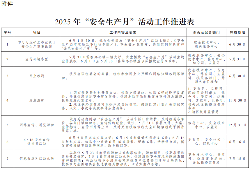 國家鐵路局關于印發2025年“安全生產月”活動實施方案的通知(國鐵安監函〔2025〕67號)
