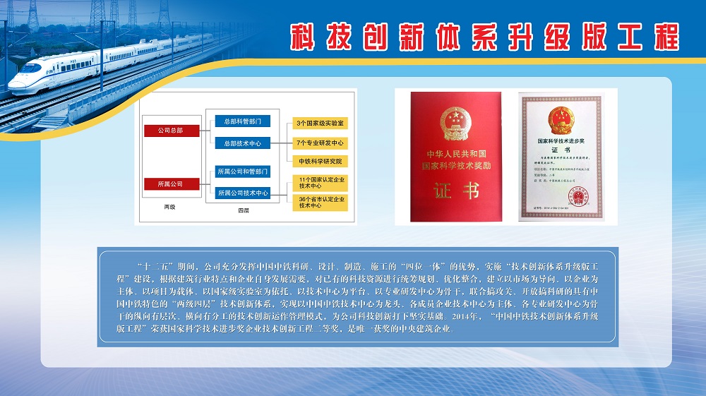 “十二五”期間,公司充分發揮中國中鐵科研、設計、制造、施工的“四位一體”的優勢,實施“技術創新體系升級版工程”建設,根據建筑行業特點和企業自身發展需要,對已有的科技資源進行統籌規劃、優化整合,建立以市場為導向、以企業為主體、以項目為載體、以國家級實驗室為依托、以技術中心為平臺、以專業研發中心為骨干,聯合搞攻關、開放搞科研的具有中國中鐵特色的“兩級四層”技術創新體系,實現以中國中鐵技術中心為龍頭、各成員企業技術中心為主體、各專業研發中心為骨干的縱向有層次、橫向有分工的技術創新的運作管理模式,為公司科技創新打下堅實基礎。2014年,“技術創新體系升級版工程”榮獲了國家科學技術進步獎企業技術創新工程類二等獎,是唯一獲獎的中央建筑企業。