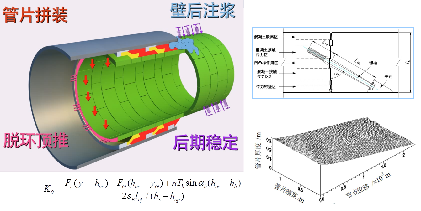 探明了管片拼裝、同步注漿、漿液凝固、后期穩(wěn)定四階段荷載特征,建立了施工期分階段的內(nèi)力分析模型和方法,開發(fā)了各階段施工荷載與水壓聯(lián)合作用下原型結(jié)構(gòu)承壓與止水能力的檢驗(yàn)技術(shù),獲發(fā)明專利4項(xiàng)。從而實(shí)現(xiàn)了現(xiàn)場管片拼裝、頂推、注漿等關(guān)鍵工序和參數(shù)的精確選擇與控制,解決了結(jié)構(gòu)止水失效、管片錯(cuò)臺(tái)開裂及隧道結(jié)構(gòu)失穩(wěn)垮塌難題,保障了施工期隧道結(jié)構(gòu)安全。