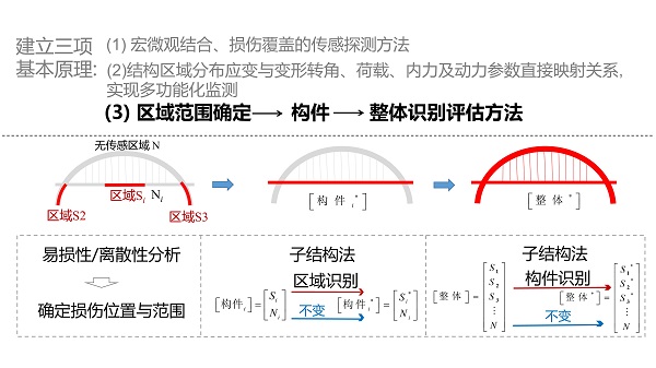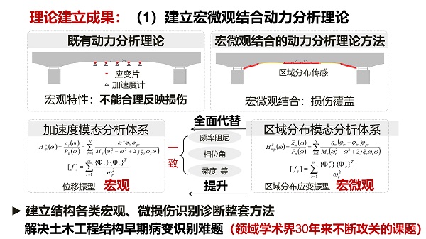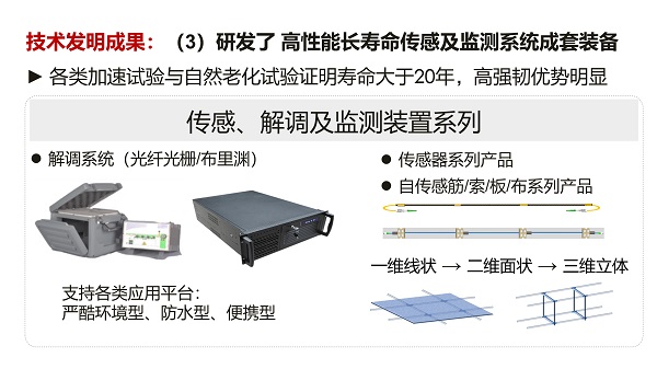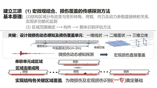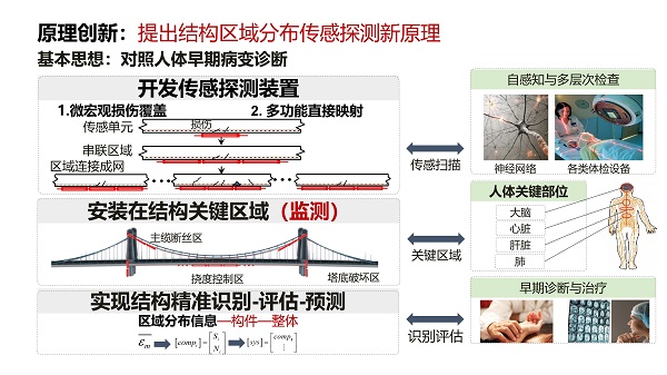 該項目針對結構健康監測傳感、裝置、評估方法存在的三大瓶頸,提出了結構區域分布傳感探測與監測評估理念,其基本思想是對照人體早期病變診斷,開發具有微宏觀損傷覆蓋與多功能直接映射功能的傳感探測裝置,安裝在結構關鍵區域獲取類似于人體關鍵部位的區域分布信息,進而實現結構全面識別、損傷早期探測及性能評估與預測。在結構區域分布傳感及監測原理創新的基礎上,進一步通過結構區域分布光纖傳感及光纖網絡一體化監測原理、技術、裝置等核心發明,建立開發了土木工程結構(群)健康監測與評估的理論體系及成套技術裝備,從而為各類工程基礎設施監測項目提供解決方案。該項目開創了結構健康監測技術新體系,取得國際領先的創新成果,對結構健康監測理論具有開拓性影響。