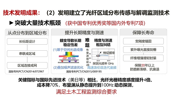 項目成果包括授權國際國內發明專利28項,發表論文200余篇(其中SCI論文82篇),形成針對結構區域分布光纖傳感與健康監測技術的中英文專著,相關成果被寫入國內地方標準和協會標準及日美土木工程學會權威報告與相關指南。研究成果應用于蘇通大橋、江蘇大劇院、長江隧道、無錫地鐵、日本鐵路橋、美國高速公路橋等50多個國內外重要工程,建成包含11座特大橋梁在內的長江流域結構群協同監測中心(其中千米級橋梁6座),解決了大量實際工程難題,直接經濟效益超4億元。