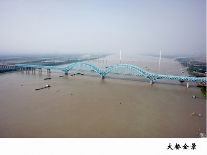 南京大勝關長江大橋是世界首座六線鐵路大橋。大橋全長9.273公里,北引橋長5.599公里,主橋及合建段引橋長3.674公里,主橋孔跨布置為兩聯(84+84)m 連續鋼桁梁+(108+192+336+336+192+108)m六跨連續鋼桁拱。
