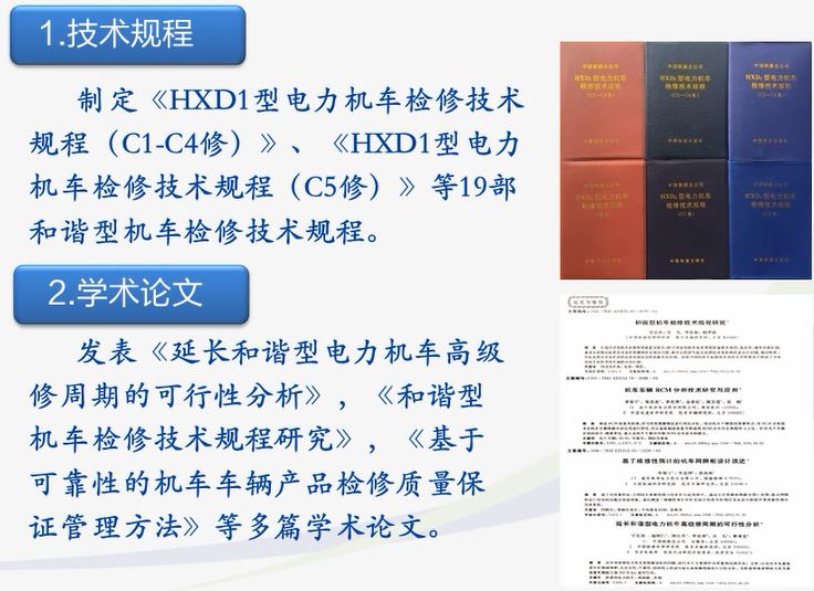 (2)學術論文多篇,如:深化風險管理 推進創(chuàng)新發(fā)展 為鐵路運輸提供堅實動力保障,申瑞源,中國鐵路;延長和諧型電力機車高級修周期的可行性分析,寧友波等,鐵道機車車輛;和諧型機車檢修技術規(guī)程研究,李忠厚等,鐵道機車車輛;基于可靠性的機車車輛產(chǎn)品檢修質(zhì)量保證管理方法,王華勝,電力機車與城軌車輛。