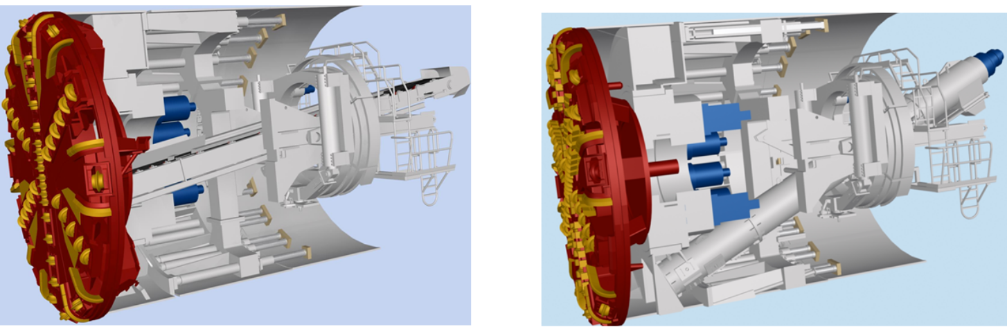 針對復雜地質條件、長距離下坡掘進所帶來的破巖、出渣、無運輸、應急排水、有害氣體等難題,從刀盤、盾體、刀盤驅動、出渣系統、物料運輸系統、防爆型排水通風系統等方面進行整機技術集成和針對設計,滿足此類工況下巷道開挖的安全、高產、高效、優質要求。