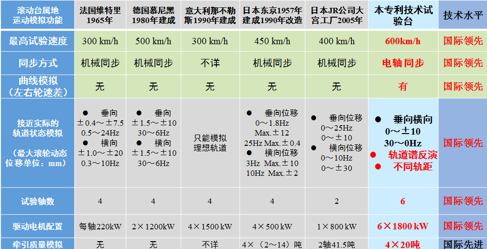 表1是世界上機車車輛整車臺架試驗臺性能比較,可以看到,基于本專利技術研制的鐵路機車車輛運行仿真試驗臺,在高速試驗速度(600km/h)、同步方式(電軸同步)、曲線模擬(左右輪差速)、軌道不平順模擬(軌道譜反演)、軸數(6根)和單軸功率等方面都達到世界最好。是世界上速度最高、功能最強、技術最先進、運用最成功的機車車輛運行模擬試驗臺。