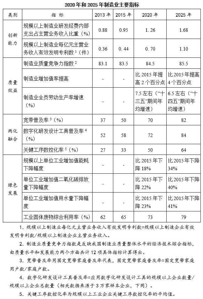 到2025年,制造業(yè)整體素質(zhì)大幅提升,創(chuàng)新能力顯著增強(qiáng),全員勞動(dòng)生產(chǎn)率明顯提高,兩化(工業(yè)化和信息化)融合邁上新臺(tái)階。重點(diǎn)行業(yè)單位工業(yè)增加值能耗、物耗及污染物排放達(dá)到世界先進(jìn)水平。形成一批具有較強(qiáng)國(guó)際競(jìng)爭(zhēng)力的跨國(guó)公司和產(chǎn)業(yè)集群,在全球產(chǎn)業(yè)分工和價(jià)值鏈中的地位明顯提升。