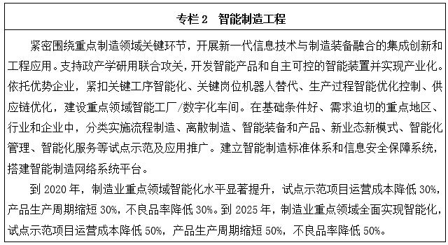 到2020年,基本實(shí)現(xiàn)工業(yè)化,制造業(yè)大國(guó)地位進(jìn)一步鞏固,制造業(yè)信息化水平大幅提升。掌握一批重點(diǎn)領(lǐng)域關(guān)鍵核心技術(shù),優(yōu)勢(shì)領(lǐng)域競(jìng)爭(zhēng)力進(jìn)一步增強(qiáng),產(chǎn)品質(zhì)量有較大提高。制造業(yè)數(shù)字化、網(wǎng)絡(luò)化、智能化取得明顯進(jìn)展。重點(diǎn)行業(yè)單位工業(yè)增加值能耗、物耗及污染物排放明顯下降。