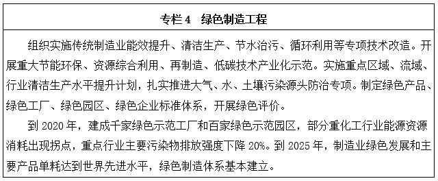 加大先進(jìn)節(jié)能環(huán)保技術(shù)、工藝和裝備的研發(fā)力度,加快制造業(yè)綠色改造升級(jí);積極推行低碳化、循環(huán)化和集約化,提高制造業(yè)資源利用效率;強(qiáng)化產(chǎn)品全生命周期綠色管理,努力構(gòu)建高效、清潔、低碳、循環(huán)的綠色制造體系。