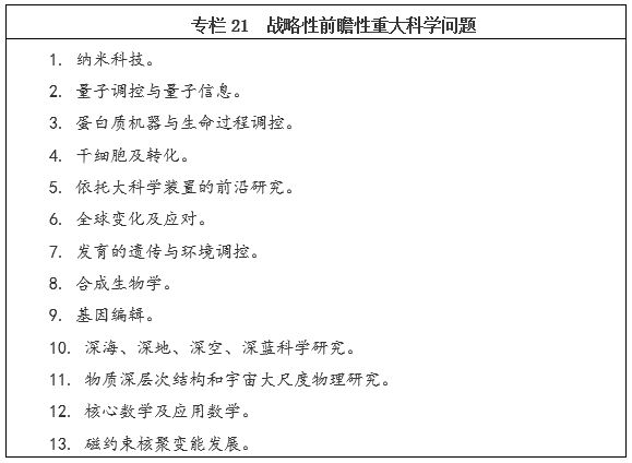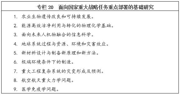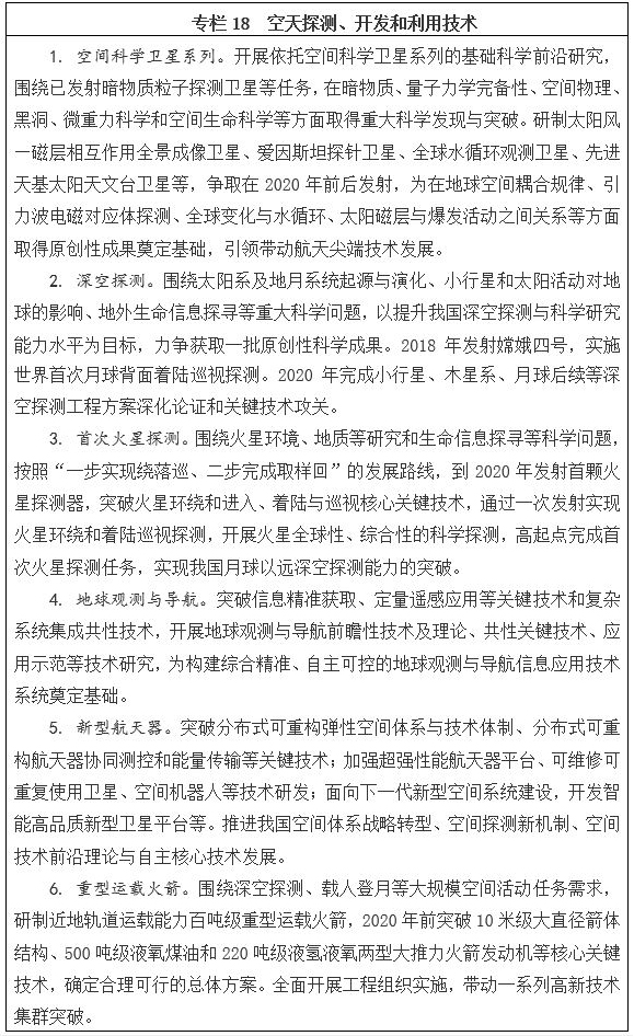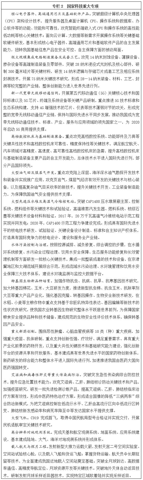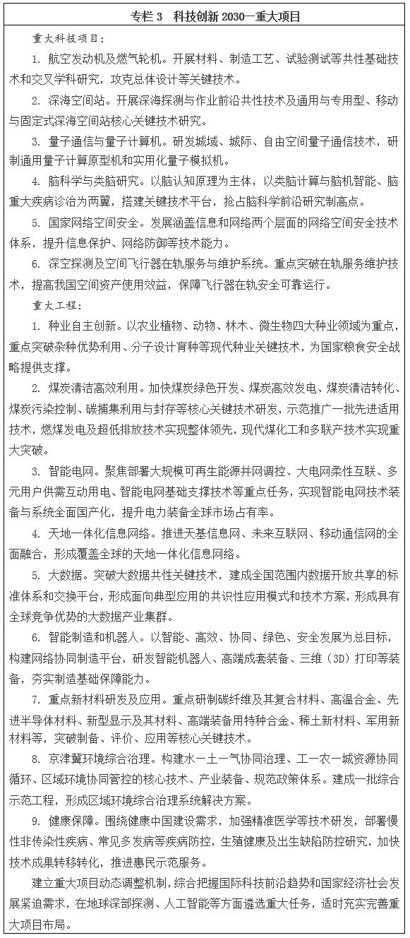 面向2030年,再選擇一批體現國家戰略意圖的重大科技項目,力爭有所突破。從更長遠的戰略需求出發,堅持有所為、有所不為,力爭在航空發動機及燃氣輪機、深海空間站、量子通信與量子計算、腦科學與類腦研究、國家網絡空間安全、深空探測及空間飛行器在軌服務與維護系統、種業自主創新、煤炭清潔高效利用、智能電網、天地一體化信息網絡、大數據、智能制造和機器人、重點新材料研發及應用、京津冀環境綜合治理、健康保障等重點方向率先突破。按照“成熟一項、啟動一項”的原則,分批次有序啟動實施。