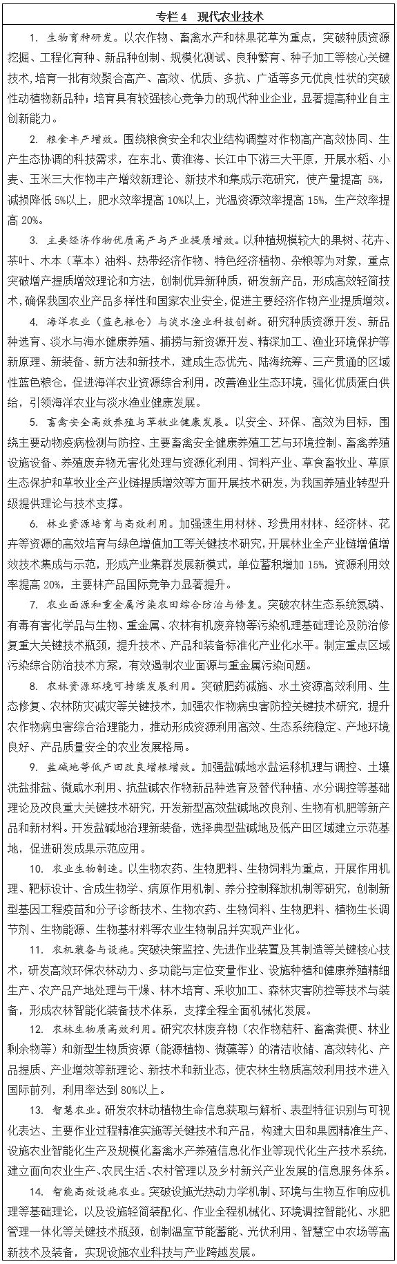 以加快推進農業現代化、保障國家糧食安全和農民增收為目標,深入實施藏糧于地、藏糧于技戰略,超前部署農業前沿和共性關鍵技術研究。以做大做強民族種業為重點,發展以動植物組學為基礎的設計育種關鍵技術,培育具有自主知識產權的優良品種,開發耕地質量提升與土地綜合整治技術,從源頭上保障國家糧食安全;以發展農業高新技術產業、支撐農業轉型升級為目標,重點發展農業生物制造、農業智能生產、智能農機裝備、設施農業等關鍵技術和產品;圍繞提高資源利用率、土地產出率、勞動生產率,加快轉變農業發展方式,突破一批節水農業、循環農業、農業污染控制與修復、鹽堿地改造、農林防災減災等關鍵技術,實現農業綠色發展。力爭到2020年,建立信息化主導、生物技術引領、智能化生產、可持續發展的現代農業技術體系,支撐農業走出產出高效、產品安全、資源節約、環境友好的現代化道路。