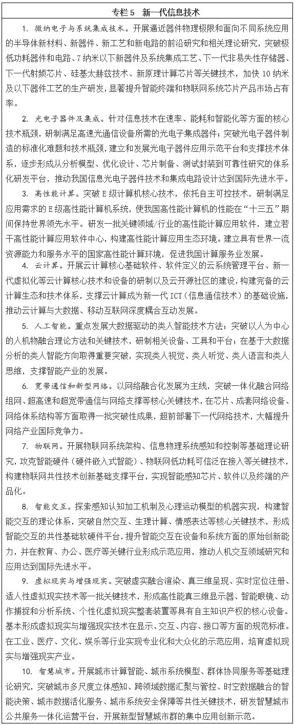 大力發展泛在融合、綠色寬帶、安全智能的新一代信息技術,研發新一代互聯網技術,保障網絡空間安全,促進信息技術向各行業廣泛滲透與深度融合。發展先進計算技術,重點加強E級(百億億次級)計算、云計算、量子計算、人本計算、異構計算、智能計算、機器學習等技術研發及應用;發展網絡與通信技術,重點加強一體化融合網絡、軟件定義網絡/網絡功能虛擬化、超高速超大容量超長距離光通信、無線移動通信、太赫茲通信、可見光通信等技術研發及應用;發展自然人機交互技術,重點是智能感知與認知、虛實融合與自然交互、語義理解和智慧決策、云端融合交互和可穿戴等技術研發及應用。發展微電子和光電子技術,重點加強極低功耗芯片、新型傳感器、第三代半導體芯片和硅基光電子、混合光電子、微波光電子等技術與器件的研發。