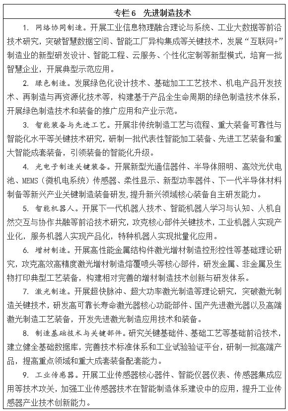 圍繞建設制造強國,大力推進制造業向智能化、綠色化、服務化方向發展。發展網絡協同制造技術,重點研究基于“互聯網+”的創新設計、基于物聯網的智能工廠、制造資源集成管控、全生命周期制造服務等關鍵技術;發展綠色制造技術與產品,重點研究再設計、再制造與再資源化等關鍵技術,推動制造業生產模式和產業形態創新。發展機器人、智能感知、智能控制、微納制造、復雜制造系統等關鍵技術,開發重大智能成套裝備、光電子制造裝備、智能機器人、增材制造、激光制造等關鍵裝備與工藝,推進制造業智能化發展。開展設計技術、可靠性技術、制造工藝、關鍵基礎件、工業傳感器、智能儀器儀表、基礎數據庫、工業試驗平臺等制造基礎共性技術研發,提升制造基礎能力。推動制造業信息化服務增效,加強制造裝備及產品“數控一代”創新應用示范,提高制造業信息化和自動化水平,支撐傳統制造業轉型升級。