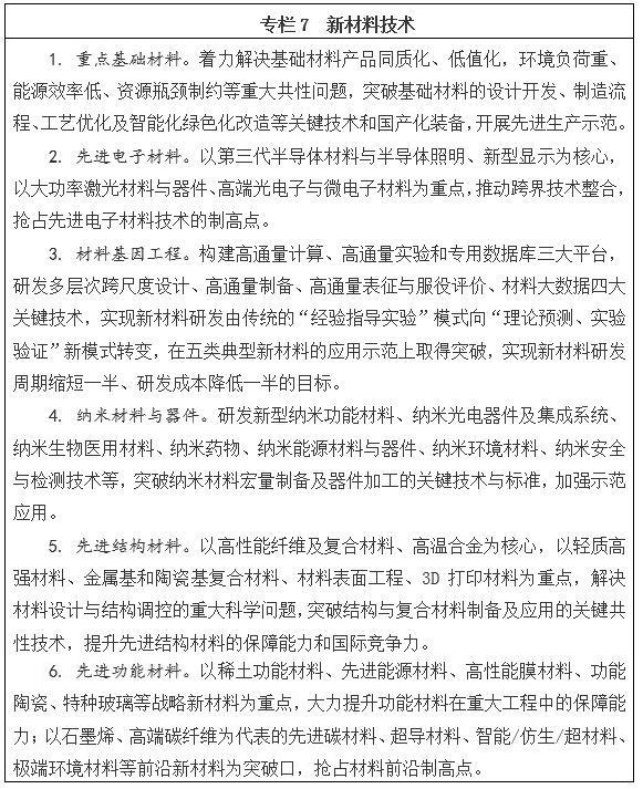 圍繞重點基礎產業、戰略性新興產業和國防建設對新材料的重大需求,加快新材料技術突破和應用。發展先進結構材料技術,重點是高溫合金、高品質特殊鋼、先進輕合金、特種工程塑料、高性能纖維及復合材料、特種玻璃與陶瓷等技術及應用。發展先進功能材料技術,重點是第三代半導體材料、納米材料、新能源材料、印刷顯示與激光顯示材料、智能/仿生/超材料、高溫超導材料、稀土新材料、膜分離材料、新型生物醫用材料、生態環境材料等技術及應用。發展變革性的材料研發與綠色制造新技術,重點是材料基因工程關鍵技術與支撐平臺,短流程、近終形、高能效、低排放為特征的材料綠色制造技術及工程應用。