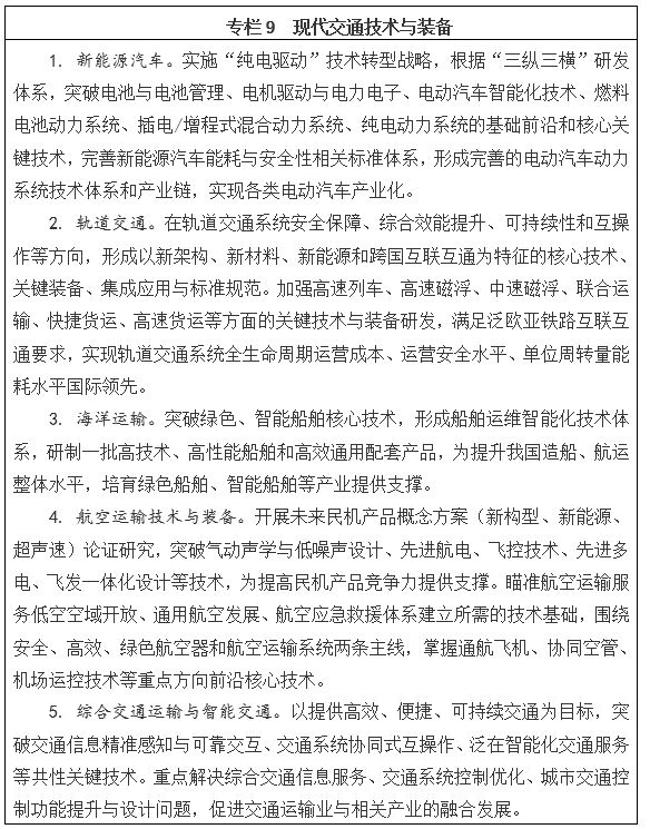 面向建設“安全交通、高效交通、綠色交通、和諧交通”重大需求,大力發展新能源、高效能、高安全的系統技術與裝備,完善我國現代交通運輸核心技術體系,培育新能源汽車、高端軌道交通、民用航空等新興產業。重點發展電動汽車智能化、網聯化、輕量化技術及自動駕駛技術,發展具有國際競爭力的高速列車、高中速磁浮、快捷貨運技術與裝備,發展軌道交通的安全保障、智能化、綠色化技術,研發運輸管理前沿技術,提升交通運輸業可持續發展能力和“走出去”戰略支撐能力。