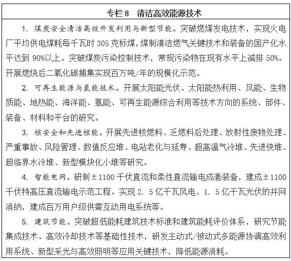 大力發展清潔低碳、安全高效的現代能源技術,支撐能源結構優化調整和溫室氣體減排,保障能源安全,推進能源革命。發展煤炭清潔高效利用和新型節能技術,重點加強煤炭高效發電、煤炭清潔轉化、燃煤二氧化碳捕集利用封存、余熱余壓深度回收利用、淺層低溫地能開發利用、新型節能電機、城鎮節能系統化集成、工業過程節能、能源梯級利用、“互聯網+”節能、大型數據中心節能等技術研發及應用。發展可再生能源大規模開發利用技術,重點加強高效低成本太陽能電池、光熱發電、太陽能供熱制冷、大型先進風電機組、海上風電建設與運維、生物質發電供氣供熱及液體燃料等技術研發及應用。發展智能電網技術,重點加強特高壓輸電、柔性輸電、大規模可再生能源并網與消納、電網與用戶互動、分布式能源以及能源互聯網和大容量儲能、能源微網等技術研發及應用。穩步發展核能與核安全技術及其應用,重點是核電站安全運行、大型先進壓水堆、超高溫氣冷堆、先進快堆、小型核反應堆和后處理等技術研發及應用。實施“科技冬奧”行動計劃,為奧運專區及周邊提供零碳/低碳、經濟智慧的能源解決方案。