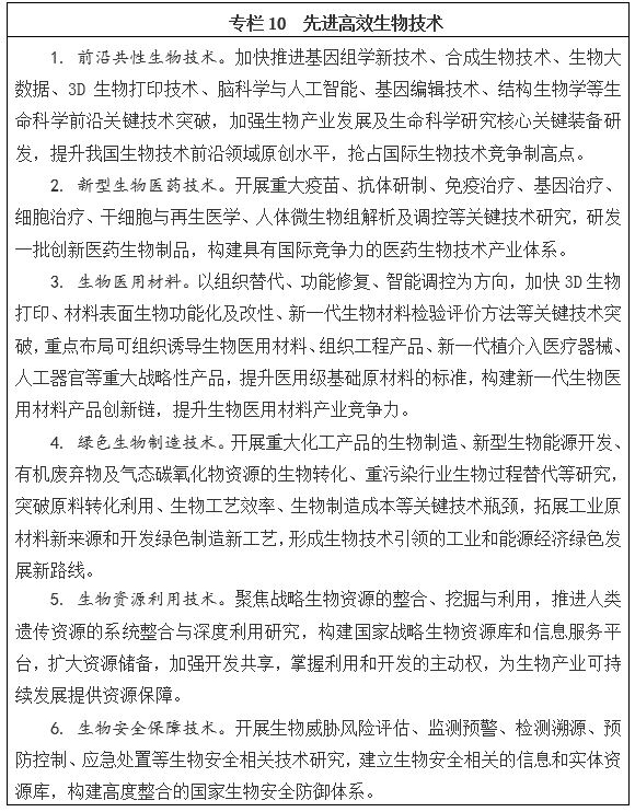 瞄準世界科技前沿,搶抓生物技術與各領域融合發展的戰略機遇,堅持超前部署和創新引領,以生物技術創新帶動生命健康、生物制造、生物能源等創新發展,加快推進我國從生物技術大國到生物技術強國的轉變。重點部署前沿共性生物技術、新型生物醫藥、綠色生物制造技術、先進生物醫用材料、生物資源利用、生物安全保障、生命科學儀器設備研發等任務,加快合成生物技術、生物大數據、再生醫學、3D生物打印等引領性技術的創新突破和應用發展,提高生物技術原創水平,力爭在若干領域取得集成性突破,推動技術轉化應用并服務于國家經濟社會發展,大幅提高生物經濟國際競爭力。
