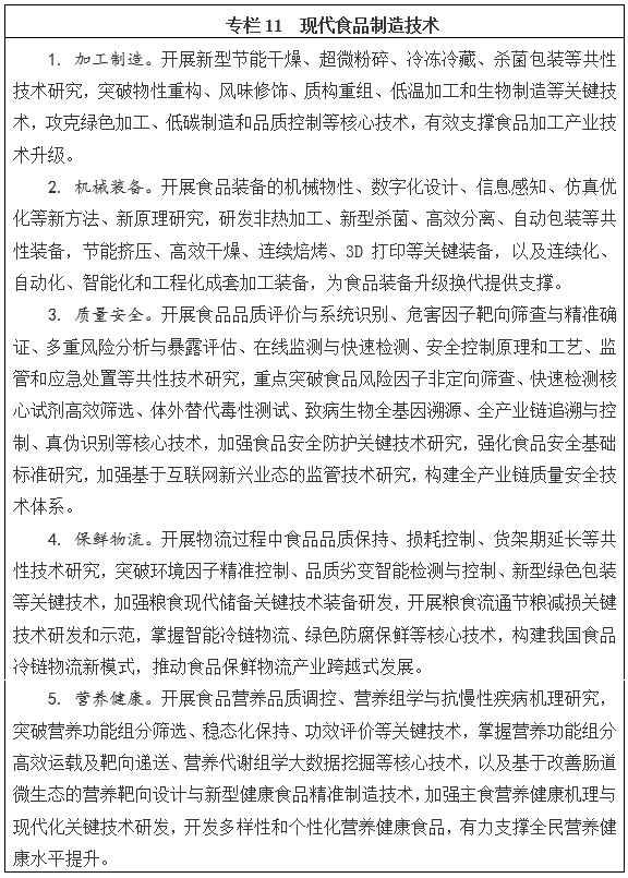 遵循現代食品制造業高科技、智能化、多梯度、全利用、低能耗、高效益、可持續的國際發展趨勢,圍繞標準化加工、智能化控制、健康型消費等重大產業需求,以現代加工制造為主線,加快高效分離、質構重組、物性修飾、生物制造、節能干燥、新型殺菌等工程化技術研發與應用;攻克連續化、自動化、數字化、工程化成套裝備制造技術,突破食品產業發展的裝備制約;重視食品質量安全,聚焦食品源頭污染問題日益嚴重、過程安全控制能力薄弱、監管科技支撐能力不足等突出問題,重點開展監測檢測、風險評估、溯源預警、過程控制、監管應急等食品安全防護關鍵技術研究;圍繞發展保鮮物流,開展智能冷鏈物流、綠色防腐保鮮、新型包裝控制、糧食現代儲備、節糧減損等產業急需技術研發;以營養健康為目標,突破營養功能組分穩態化保持與靶向遞送、營養靶向設計與健康食品精準制造、主食現代化等高新技術。力爭到2020年,在營養優化、物性修飾、智能加工、低碳制造、冷鏈物流、全程控制等技術領域實現重大突破,形成較為完備的現代食品制造技術體系,支撐我國現代食品制造業轉型升級和持續發展。