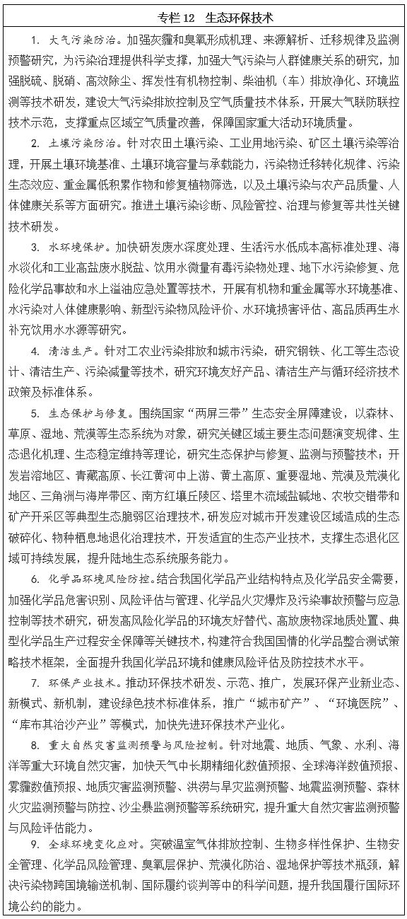 突破生態評估、產品生態設計和實現生態安全的過程控制與綠色替代關鍵技術。開發環境健康風險評估與管理技術、高風險化學品的環境友好替代技術,開展重大工程生態評價與生態重建技術研究。在京津冀地區、長江經濟帶等重點區域開展環境污染防治技術應用試點示范,促進綠色技術轉移轉化,加強環保高新技術產業園區建設,推動形成區域環境治理協同創新共同體。開發生態環境大數據應用技術,建立智慧環保管理和技術支撐體系。力爭實現生態環保技術的跨越發展,為我國環境污染控制、質量改善和環保產業競爭力提升提供科技支撐。