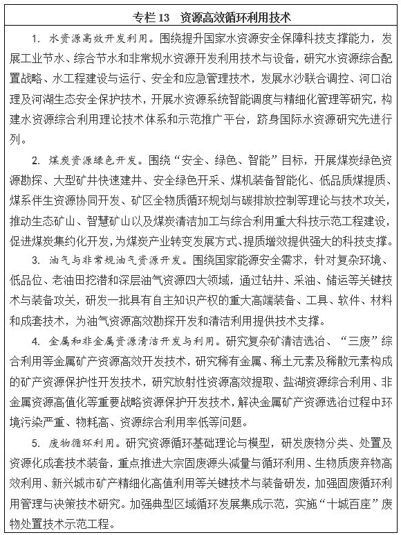 以保障資源安全供給和促進資源型行業綠色轉型為目標,大力發展水資源、礦產資源的高效開發和節約利用技術。在水土資源綜合利用、國土空間優化開發、煤炭資源綠色開發、天然氣水合物探采、油氣與非常規油氣資源開發、金屬資源清潔開發、鹽湖與非金屬資源綜合利用、廢物循環利用等方面,集中突破一批基礎性理論與核心關鍵技術,重點研發一批重大關鍵裝備,構建資源勘探、開發與綜合利用理論及技術體系,解決我國資源可持續發展保障、產業轉型升級面臨的突出問題;建立若干具有國際先進水平的基礎理論研究與技術研發平臺、工程轉化與技術轉移平臺、工程示范與產業化基地,逐步形成與我國經濟社會發展水平相適應的資源高效利用技術體系,為建立資源節約型環境友好型社會提供強有力的科技支撐。
