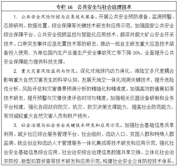 圍繞平安中國建設,以建立健全公共安全體系為導向,以提高社會治理能力和水平為目的,針對公共安全共性基礎科學問題、國家公共安全綜合保障、社會安全監測預警與控制、重特大生產安全事故防控與生產安全保障、國家重大基礎設施安全保障、城鎮公共安全風險防控與治理、綜合應急技術裝備等方面開展公共安全保障關鍵技術攻關和應用示范,形成主動保障型公共安全技術體系。聚焦地震災害、地質災害、氣象災害、水旱災害、海洋災害等重大自然災害基礎理論問題,重點災種的關鍵技術環節和巨災頻發與高危險區域,開展重大自然災害監測預警、風險防控與綜合應對關鍵科學技術問題基礎研究、技術研發和集成應用示范。運用現代科技改進社會治理方法和手段,開展社會治理公共服務平臺多系統和多平臺信息集成共享、政策仿真建模和分析技術研究,開展社會基礎信息、信用信息等數據共享交換關鍵技術和綜合應用技術研究。力爭到2020年,形成較為完備、可靠、高效的公共安全與社會治理技術體系,為經濟社會持續穩定安全發展提供科技保障。