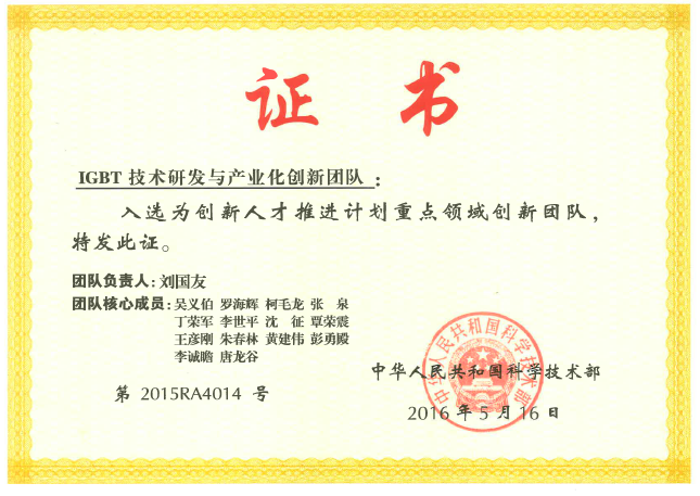 為突破 IGBT 關鍵技術、結束 IGBT 產品長期依賴進口的局面,該團隊負責人劉國友2010 年受命成立功率半導體海外研發中心,組建一支專門從事IGBT基礎核心前沿技術研發的團隊,成員包含設計、工藝和應用工程師等研發人員,專業領域覆蓋材料、微電子、半導體物理等學科,目前已形成 100人以上、高端人才匯聚的研發團隊。在院士領銜、團隊負責人帶領下,本團隊研發的 IGBT 領域新產品、新工藝,特別是新一代高功率密度 IGBT 芯片與模塊關鍵技術,已達到國際先進水平,產品與國際同類產品相當。十二五期間 ,團隊承擔國家 02 專項、“863”計劃、國家發改委專項等 10 余項國家級項目,先后完成軌道交通用 3300VIGBT 芯片及模塊、3300V-6500V 高功率密度 IGBT 芯片及模塊的研究開發,達到國際先進水平并實現批量應用。團隊核心成員在 IGBT 技術領域申報專利 50 余項,在國內外核心期刊和國際會議發表論文 30 余篇,獲得省部級及以上科技進步獎 7 項,形成一整套具有自主知識產權的 IGBT 芯片及其模塊“設計—工藝—應用”產業化技術,徹底打破國外的技術封鎖與產品壟斷。通過集成創新,本團隊支撐建成國內領先、國際一流的 8 英寸 IGBT 芯片線及其自動化的模塊封裝線。該團隊研究技術成果達到國際先進水平并實現批量應用,迫使國外產品多次大幅降價,徹底擺脫軌道交通、智能電網等戰略性新興產業對國外核心器件的依賴,確保國家安全與國民經濟健康發展。