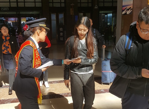 10月23日,國家鐵路局組織在北京南站、北京站、北京西站開展“信用鐵路宣傳月”宣傳活動,向廣大旅客宣傳鐵路行業誠信體系建設情況和鐵路信用管理有關要求,促進樹立誠實守信意識。各車站積極響應并給予全力配合,安排醒目位置放置宣傳展板,組織職工發放宣傳冊。