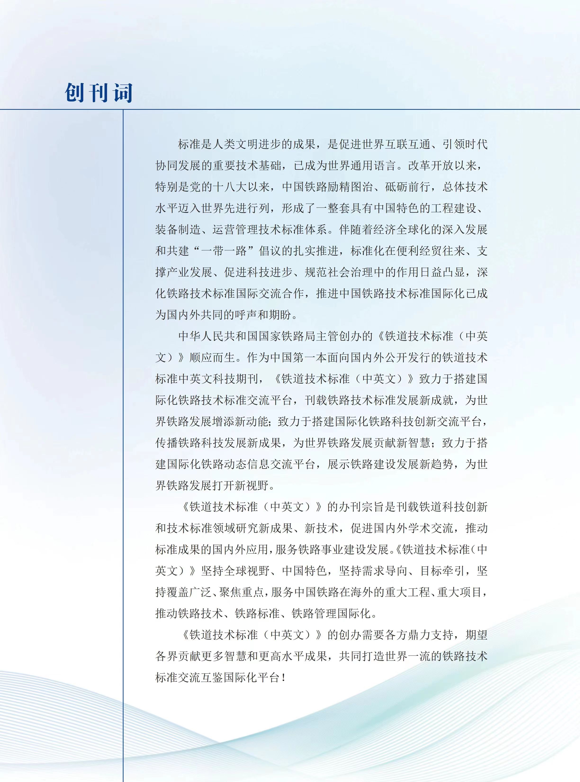 《鐵道技術標準(中英文)》(Railway Technical Standard(Chinese&English))由國家鐵路局主管,國家鐵路局規劃與標準研究院主辦,《鐵道技術標準(中英文)》編輯部出版,是中國第一本面向國內外公開發行的鐵路行業技術標準中英文科技期刊。本刊2019年創刊,月刊,A4開本,每月10日出版。