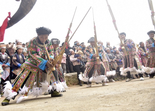 次日寅時(即凌晨3-5點鐘),人們將鼓藏牛牽到“祭祖堂”,由鼓藏頭念了一陣《祭祖詞》后,各家各戶便開始殺牛祭祖,祈求上天保佑,祝愿人人平安。然后大宴賓朋,直到第7天吃鼓藏結束。