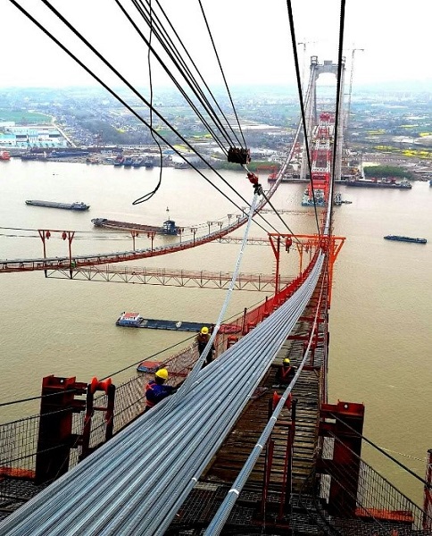 5.世界上主纜直徑最大的懸索橋。五峰山長江大橋主纜直徑達到1.3m,是世界上目前最大直徑主纜。