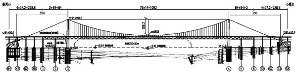 主橋為(84+84+1092+84+84)m雙塔連續鋼桁梁公鐵兩用懸索橋,連續鋼桁梁采用板桁結合加勁梁結構,桁高16m,節間距14m,主桁橫向中心距30m。主纜每根索股長度約1932m,重約47.8t,主纜擠圓后直徑為1.3m。吊索與索夾采用銷接式連接,索夾均采用上下對合型結構。