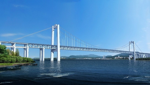 五峰山長江特大橋是連鎮鐵路跨越長江的新型大型結構工程,橋北位于鎮江市丹徒區高橋鎮,橋南位于鎮江市新區五峰山腳下,設計里程DK273+073.310~DK279+482.219,全長6408.909m;其中主橋長1428m。鐵路設計行車速度250km/h,正線線間距4.6m,預留兩線鐵路。高速公路雙向八車道,設計行車速度100公里/小時。