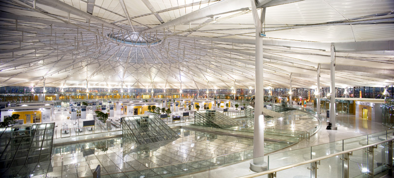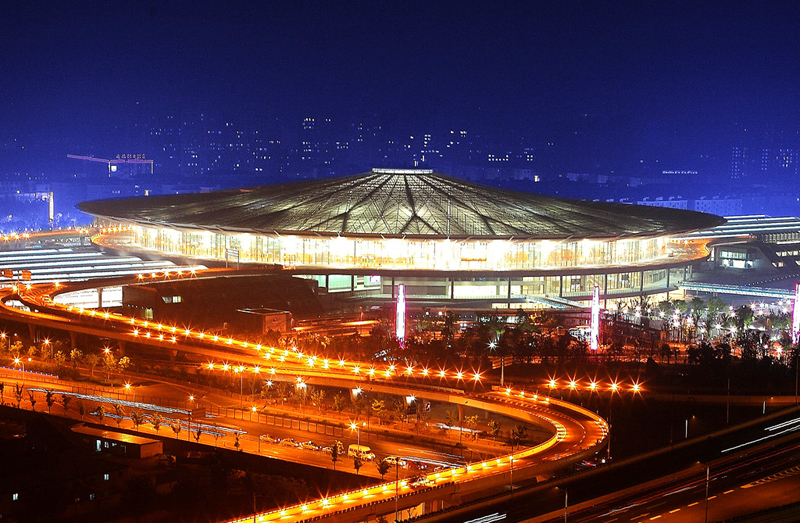 1.圓形鋼屋蓋吊裝采用自主創新研制的“大跨度張弦式回轉龍門吊”施工,由于施工環境復雜、施工場地狹小,常規大型吊裝設備無法進入結構內部施工,故在施工中采用大跨度張弦式回轉龍門吊對稱吊裝圓形鋼屋蓋,較好的解決了超大型圓形鋼屋蓋的吊裝問題;2.9.9m平臺超長環型預應力梁采用分塊施工方法,解決了大量回填土下高空大面積排架搭設,工字形大截面梁鋼筋、模板、砼施工、多方向預應力張拉順序確定,在次應力情況下張拉力控制以及跨越鐵路營業線施工的安全防護問題;3.既有滬杭線翻交基坑圍護施工技術應用,運行中的滬杭鐵路距站房僅5.2m,為保證鐵路運行安全以及基坑圍護結構安全,站房地下工程施工分為南北兩塊先后施工,通過滬杭鐵路翻交保證了鐵路運行和工程施工安全;4.9.9m平臺環型框架結構柱采用直徑1m的鋼管勁性柱,鋼管柱內為C60砼,鋼管柱外為C40砼;5.站場線路采用寬軌枕線路;6.鐵路無站臺柱雨棚應用鑄鋼節點,保證了雨棚受力合理,安全可靠;7.鋼屋蓋采用鋁板和陽光板組合形式,白天候車室照明采用自然采光,節能環保。