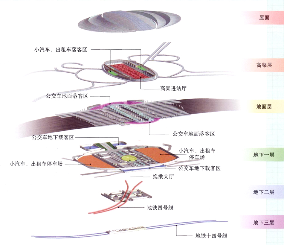 如北京南站送站小汽車落客區(qū)設(shè)在高架進(jìn)站廳的東西兩側(cè),公交車落客區(qū)貼臨地面進(jìn)站廳設(shè)置,兩條地鐵線的站廳設(shè)在地下出站廳的中央部位,出租車待客區(qū)位于地下出站廳兩側(cè)的夾層內(nèi),旅客在站房?jī)?nèi)部通過綜合的交通換乘空間可以完成進(jìn)出站,實(shí)現(xiàn)了“近距離換乘”。