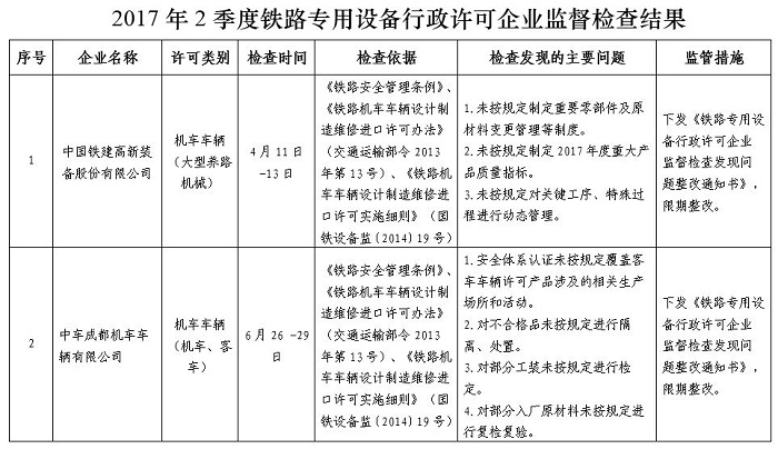 2017年2季度,成都鐵路監督管理局認真貫徹落實國務院“簡政放權、放管結合、優化服務”和“雙隨機、一公開”監管改革精神,持續加強鐵路專用設備產品質量安全監管工作。依據《2017年度鐵路專用設備行政許可企業監督檢查計劃》(國鐵設備監函〔2016〕188號),監督檢查鐵路專用設備行政許可企業2家,發現問題7項,下發《鐵路專用設備行政許可企業監督檢查發現問題整改通知書》2份,同時要求相關企業對監督檢查發現的問題進行整改,并將整改措施和整改情況及時報成都鐵路監督管理局。現將監督檢查結果通報如下: