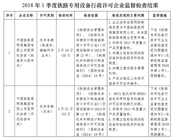 2018年1季度,成都鐵路監督管理局認真貫徹落實國務院“簡政放權、放管結合、優化服務”和“雙隨機、一公開”監管改革精神,持續加強鐵路專用設備產品質量安全監管工作。依據《2018年度鐵路專用設備行政許可企業監督檢查計劃》(國鐵設備監函〔2017〕181號),監督檢查鐵路專用設備行政許可企業2家,下發《鐵路專用設備行政許可企業監督檢查發現問題整改通知書》2份,并要求相關企業對監督檢查發現的問題進行整改,將整改措施和整改情況及時報成都鐵路監督管理局?,F將監督檢查結果通報如下: