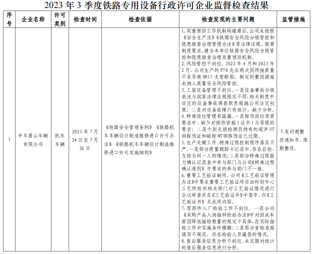 2023年3季度,成都鐵路監督管理局按照《行政許可法》《鐵路安全管理條例》《鐵路機車車輛設計制造維修進口許可辦法》《鐵路運輸基礎設備生產企業審批辦法》等法律法規、規章規范性文件有關規定,依據《國家鐵路局關于印發<2023年度鐵路專用設備行政許可企業監督檢查計劃>的通知》(國鐵設備監函〔2023〕1號),依法對中車眉山車輛有限公司開展監督檢查,發現問題8項,下發問題整改通知書1份, 要求受檢企業對監督檢查發現的問題進行整改,將整改措施和整改情況及時報送成都鐵路監督管理局。現將監督檢查結果通報如下: