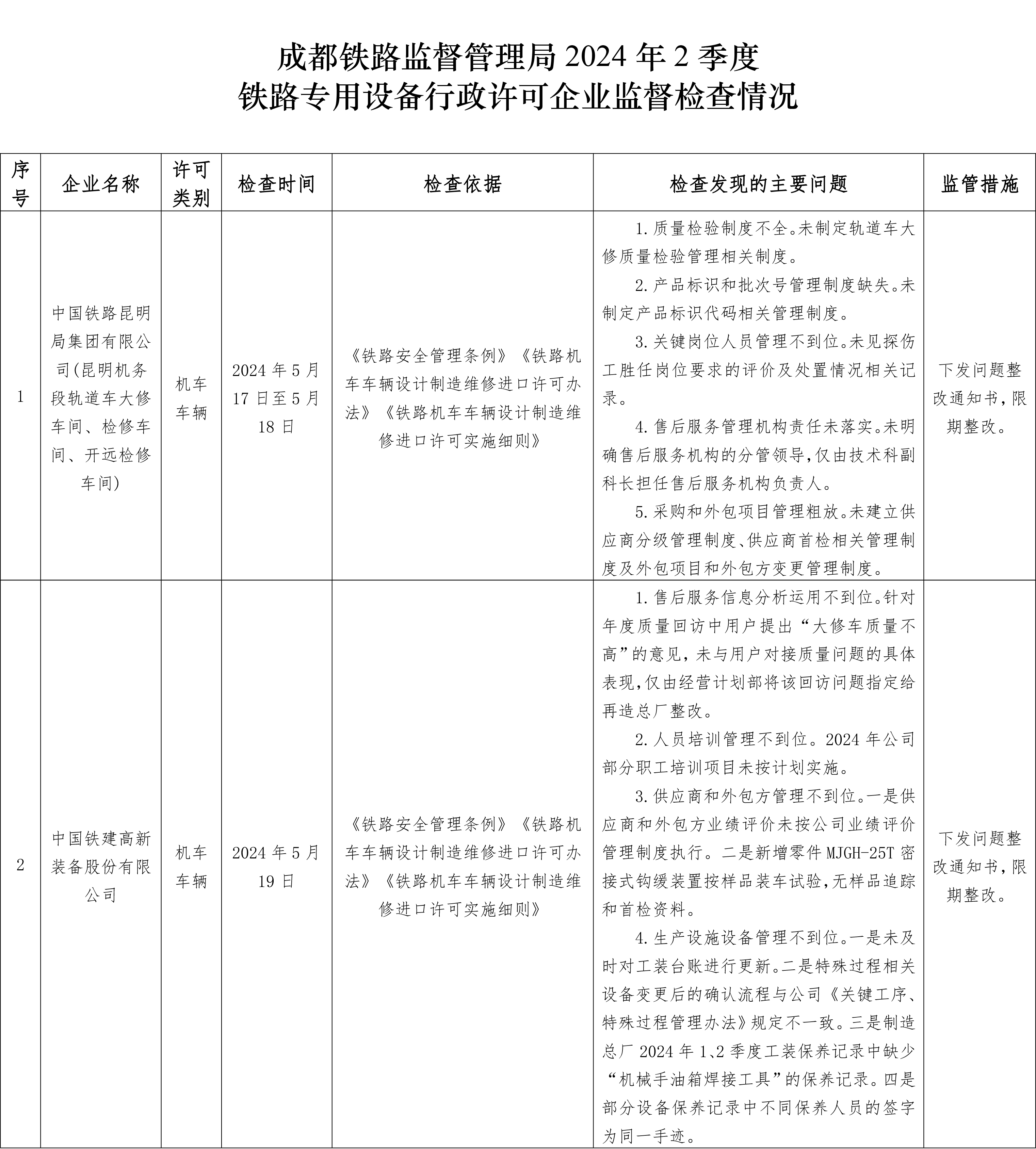 2024年2季度,成都鐵路監督管理局依據《行政許可法》《鐵路安全管理條例》《鐵路機車車輛設計制造維修進口許可辦法》《鐵路運輸基礎設備生產企業審批辦法》等法律法規、規章規范,按照《國家鐵路局關于印發<2024年度鐵路專用設備行政許可企業監督檢查計劃>的通知》(國鐵設備監函〔2024〕3號)要求,依法對中國鐵路昆明局集團有限公司(昆明機務段軌道車大修車間、檢修車間、開遠檢修車間)、中國鐵建高新裝備股份有限公司開展監督檢查,發現問題9項,下發問題整改通知書2份,要求受檢企業對監督檢查發現的問題進行整改,將整改措施和整改情況及時報送成都鐵路監督管理局。現將監督檢查結果通報如下: