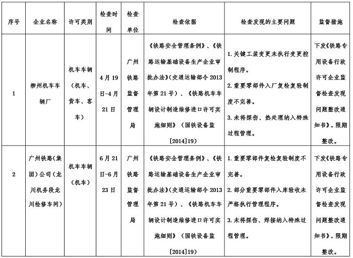 2017年2季度,在國家鐵路局黨組的領導下,廣州鐵路監督管理局認真貫徹落實國務院“放管服”改革和“雙隨機、一公開”監管改革要求,持續加強鐵路設備產品質量安全監管工作。按照《2017年度鐵路專用設備行政許可企業監督檢查計劃》(國鐵設備監函〔2016〕188號)安排,監督檢查鐵路專用設備行政許可企業2家,發現問題14項,下發《鐵路專用設備行政許可企業監督檢查發現問題整改通知書》2份。對監督檢查發現的問題,要求企業制定落實整改措施,并將整改完成情況及時報廣州鐵路監督管理局。廣州鐵路監督管理局將結合履職工作實際,適時對企業整改情況進行復查。現將監督檢查結果通報如下: