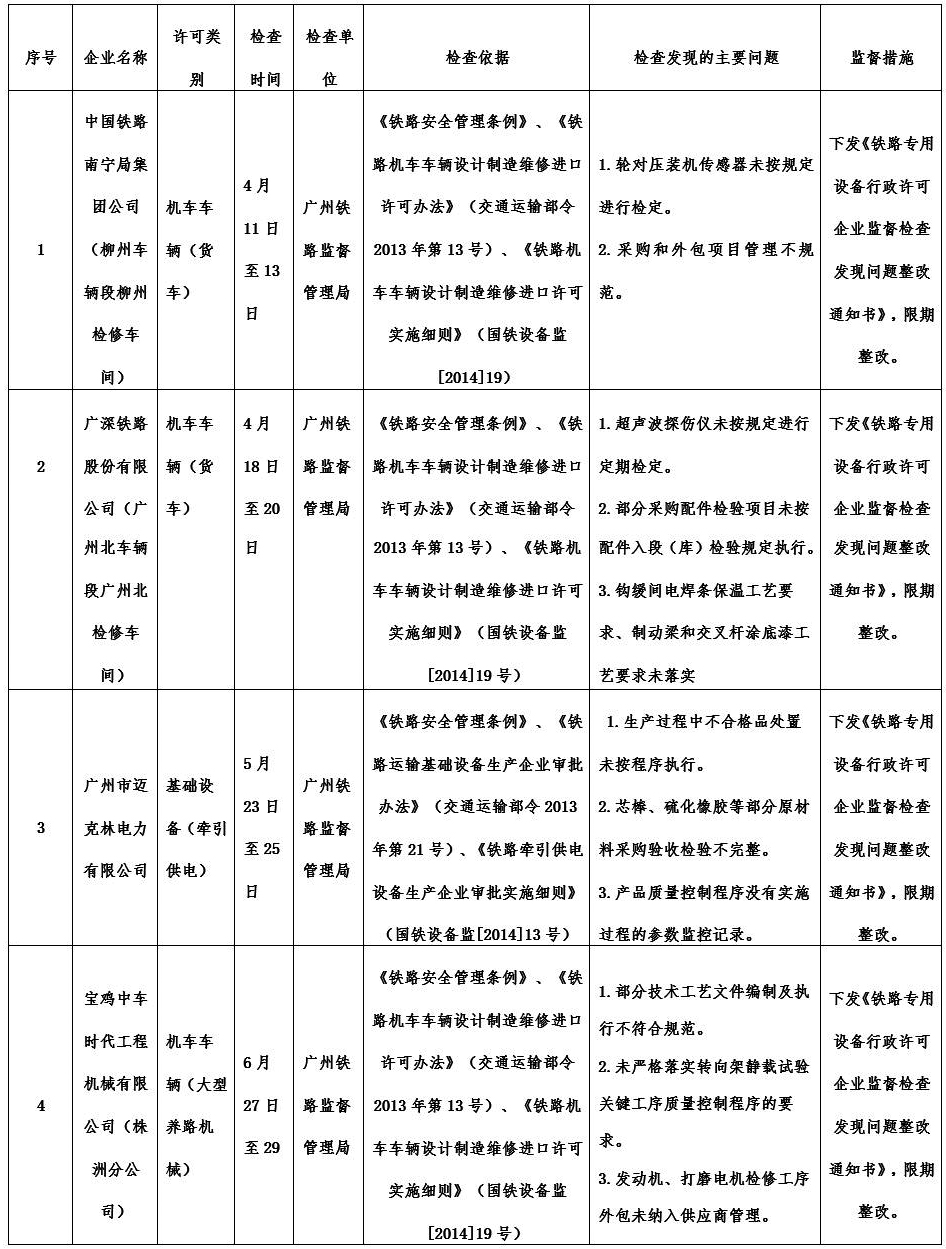 2018年2季度,廣州鐵路監督管理局認真貫徹落實國務院“簡政放權、放管結合、優化服務”和“雙隨機、一公開”監管改革精神,持續加強鐵路專用設備產品質量安全監管工作。按照《行政許可法》、《鐵路安全管理條例》等法律法規和鐵路專用設備相關行政許可辦法及實施細則有關規定,依據《鐵路專用設備行政許可企業監督檢查計劃管理辦法》(國鐵設備監〔2014〕27號)、《2018年度鐵路專用設備行政許可企業監督檢查計劃》(國鐵設備監〔2017〕181號),依法對中國鐵路南寧局集團公司(柳州車輛段柳州檢修車間)、廣深鐵路股份有限公司(廣州北車輛段廣州北檢修車間)、廣州市邁克林電力有限公司、寶雞中車時代工程機械有限公司(株洲分公司)開展監督檢查,發現問題25項,下發《鐵路專用設備行政許可企業監督檢查發現問題整改通知書》4份。同時要求相關企業對監督檢查發現的問題進行整改,并將整改措施和整改情況及時報廣州鐵路監督管理局。廣州鐵路監督管理局將結合履職工作實際,適時對企業整改情況進行復查。現將監督檢查結果通報如下: