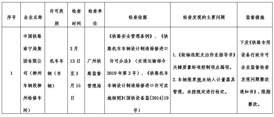 按照《行政許可法》、《鐵路安全管理條例》等法律法規和鐵路專用設備相關行政許可辦法及實施細則有關規定,依據《鐵路專用設備行政許可企業監督檢查計劃管理辦法》(國鐵設備監〔2014〕27號)、《2019年度鐵路專用設備行政許可企業監督檢查計劃》(國鐵設備監〔2019〕2號),依法對中國鐵路南寧局集團有限公司(柳州車輛段柳州檢修車間)開展監督檢查,共發現問題4項,下發《鐵路專用設備行政許可企業監督檢查發現問題整改通知書》1份。同時要求相關企業對監督檢查發現的問題進行整改,并將整改措施和整改情況及時報廣州鐵路監督管理局。廣州鐵路監督管理局將結合履職工作實際,適時對企業整改情況進行復查?,F將監督檢查結果通報如下: