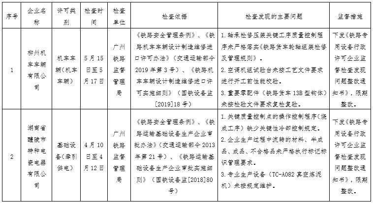按照《行政許可法》、《鐵路安全管理條例》等法律法規(guī)和《鐵路機車車輛設計制造維修進口許可辦法》及實施細則、《鐵路運輸基礎設備生產(chǎn)企業(yè)審批辦法》及實施細則有關規(guī)定,依據(jù)《鐵路專用設備行政許可企業(yè)監(jiān)督檢查計劃管理辦法》(國鐵設備監(jiān)〔2014〕27號)、《2019年度鐵路專用設備行政許可企業(yè)監(jiān)督檢查計劃》(國鐵設備監(jiān)〔2019〕2號),依法對柳州機車車輛有限公司、湖南省醴陵市特種電瓷電器有限公司開展監(jiān)督檢查,共發(fā)現(xiàn)問題11項,下發(fā)《鐵路專用設備行政許可企業(yè)監(jiān)督檢查發(fā)現(xiàn)問題整改通知書》2份。同時要求相關企業(yè)對監(jiān)督檢查發(fā)現(xiàn)的問題進行整改,并將整改措施和整改情況及時報廣州鐵路監(jiān)督管理局。廣州鐵路監(jiān)督管理局將結(jié)合履職工作實際,適時對企業(yè)整改情況進行復查。現(xiàn)將監(jiān)督檢查結(jié)果通報如下: