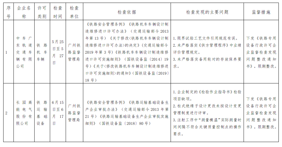 按照《行政許可法》《鐵路安全管理條例》等法律法規,以及《鐵路機車車輛設計制造維修進口許可辦法》《鐵路運輸基礎設備生產企業審批辦法》《鐵路機車車輛設計制造維修進口許可實施細則》《鐵路運輸基礎設備生產企業審批實施細則》有關規定,依據《鐵路專用設備行政許可企業監督檢查計劃管理辦法》(國鐵設備監〔2014〕27號)、《2022年度鐵路專用設備行政許可企業監督檢查計劃》(國鐵設備監函〔2022〕6號),依法對中車廣東軌道交通車輛有限公司、長園高能電氣股份有限公司開展監督檢查,共發現問題13項,下發《鐵路專用設備行政許可企業監督檢查發現問題整改通知書》2份。同時要求相關企業對監督檢查發現的問題進行整改,并將整改措施和整改情況及時報廣州鐵路監督管理局。廣州鐵路監督管理局將結合履職工作實際,適時對企業整改情況進行復查?,F將監督檢查結果通報如下: